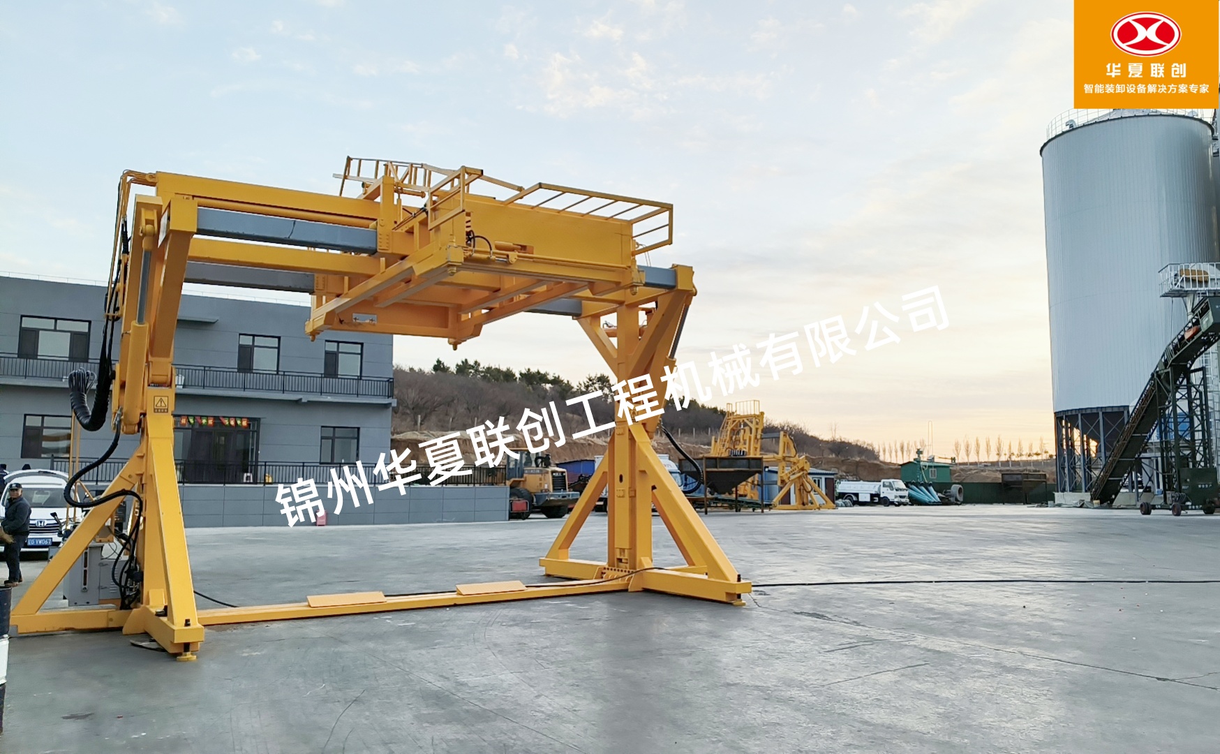 集裝箱翻轉機是可以翻轉的舉升裝置,在工作過程中,通過翻轉機的翻轉力臂,將集裝箱翻轉180°;通過上架體的工程油缸調整,可精準定位并抓取集裝箱,從而達到將集裝箱裝滿的目的。該設備移動也是非常方便,用集裝箱托運車就可以將設備短距離移動。